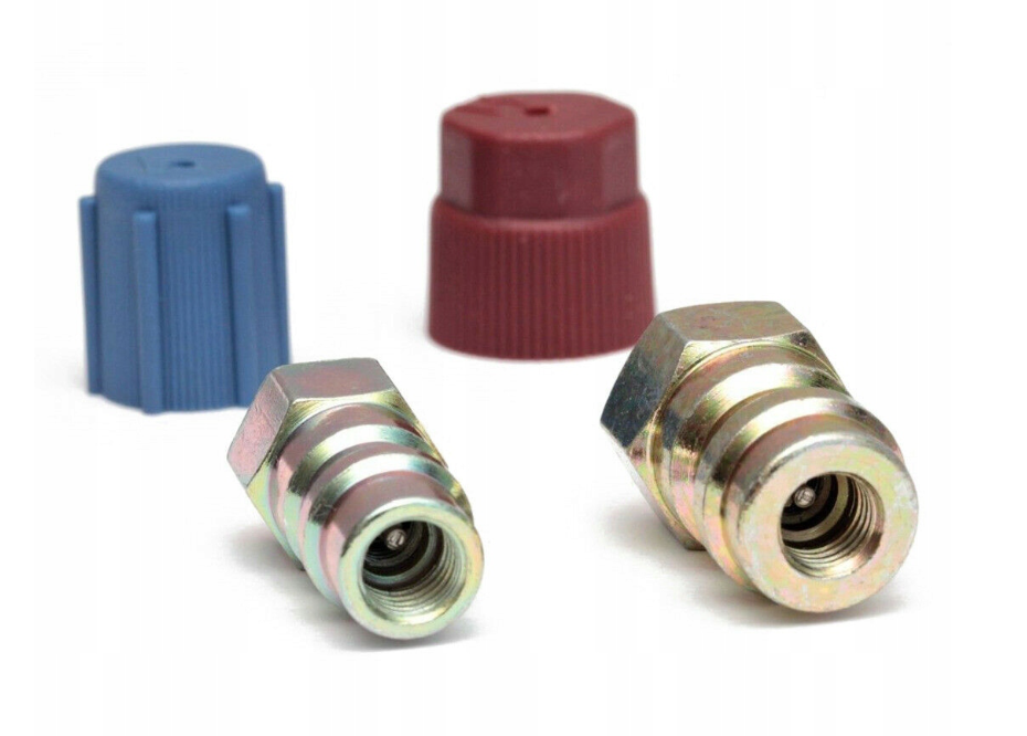Dwa adaptery wysokiego (HP) i niskiego (LP) ciśnienia, dzięki którym możemy podłączyć się z gwintem 1/4 SAE (R12).