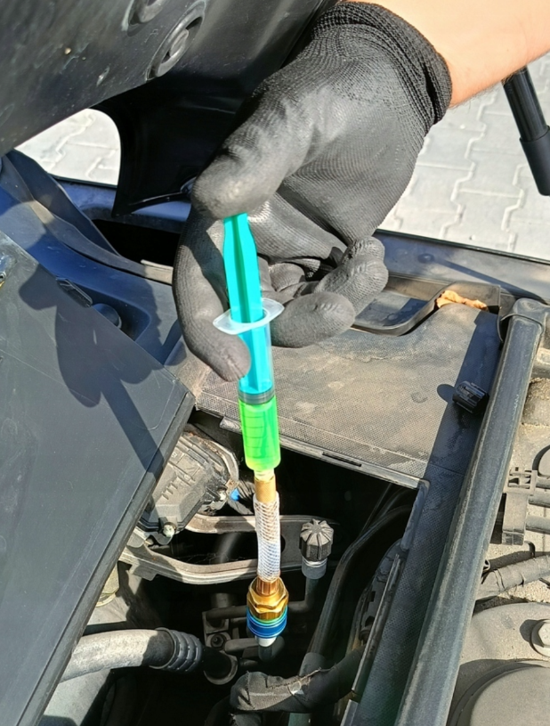 Wysokiej jakości barwnik UV w kolorze żółtym przeznaczony do szybkiego i precyzyjnego wykrywania wycieków czynnika chłodniczego w układach klimatyzacji samochodowej. Produkt wyposażony jest w metalowy adapter do gazu R134a, co ułatwia bezpośrednie wprowadzenie barwnika do instalacji.