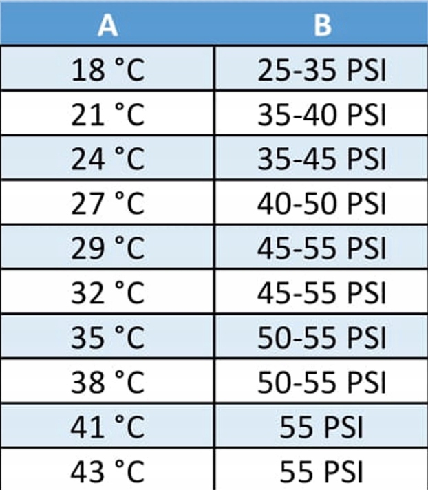 Przy 25°C ciśnienie powinno wynosić między 40 a 50 PSI. Zarówno 41, jak i 49 PSI są prawidłowe.